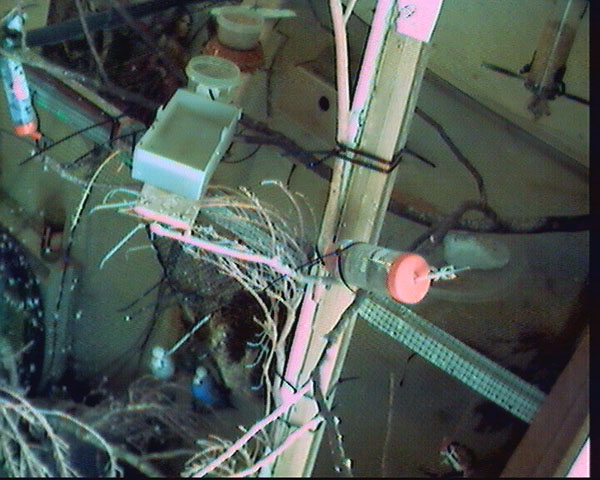 PURPLE FEEDER PILLAR: Two empty home-brew cans soldered together and half filled with stones.
