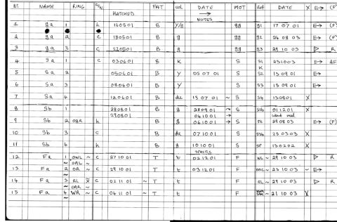 COLUMN 10 = SPECIFIES HATCHING OR LAYING IN COLUMN 9 (ENCIRCLED " +" = LAYING, " +" = HATCHING)