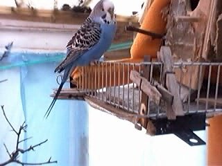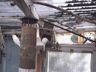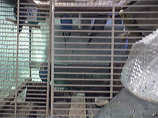 This clip was taken in May 2003 and shows the left hand side of the cabinet nests. The budgie caught on the fleece I called "B" and his mate Snowy, (albino hen in the bottom left nest). "B" was a very capable and intelligent bird and also very highly sexed, Although not the top ranking bird in terms of combat, he was number one with the hens. Snowy was a very beautiful and sought after hen and despite her mates' frequent partners, remained true to him, Frostie, another albino hen who I believe was Snowys' mother lived in the nest above. At this particular time "B" was seeing her while Snowy was incubating eggs. Apparently he managed to get his claw caught in the fleece when visiting her. It's interesting the way one bird seems to take the opportunity to settle old scores. Prince (blue budgie) was a homosexual bird and followed "B" around a lot. Was this "cattiness" on the part of him in response to being continually rejected? Also "B" seems to reject all offers of help including that from Prince. Maybe this would have had a negative impact on his standing in the flock should he have been freed by a lower ranking bird. The cockatiels' behaviour is quite ambiguous - on the one hand he appears to intervene when Prince begins to preen him. but them attacks him. The green chick is one of "B" and Snowys' daughters.